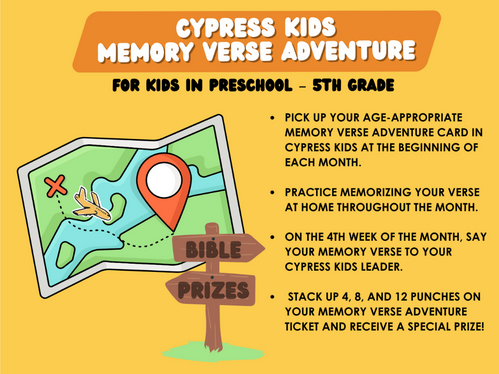 Your child will have the opportunity to join our Memory Verse Adventure. Each month, they can work on memorizing their verse at home with your help, then say it to their leader and receive prizes!